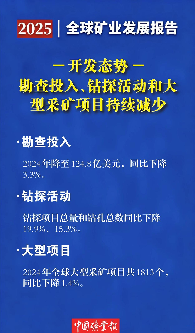 勘查開發(fā)方面,《報(bào)告》顯示,全球勘查投入、鉆探活動(dòng)和大型采礦項(xiàng)目持續(xù)減少。2024年,全球主要固體礦產(chǎn)勘查投入124.8億美元,同比下降3.3%;鉆探項(xiàng)目總量和鉆孔總數(shù)同比分別下降19.9%15.3%;全球大型采礦項(xiàng)目共1813 個(gè),同比下降1.4%。