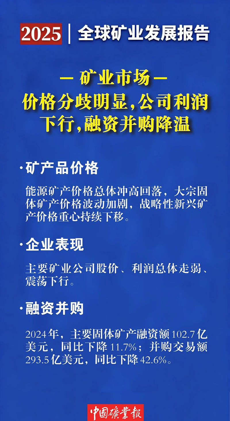 市場價(jià)格方面,《報(bào)告》顯示,國際礦產(chǎn)品價(jià)格分歧顯著,礦業(yè)公司股價(jià)和利潤總體下行,礦業(yè)融資和并購交易市場雙雙降溫。能源礦產(chǎn)價(jià)格總體沖高回落,煤炭均價(jià)較2023年下降超兩成;大宗固體礦產(chǎn)價(jià)格波動(dòng)加劇,鐵礦石價(jià)格年內(nèi)下跌超三成,銅、鋁、鋅價(jià)格略有上漲;戰(zhàn)略性新興礦產(chǎn)供強(qiáng)需弱,價(jià)格重心持續(xù)下移;農(nóng)用礦產(chǎn)價(jià)格先抑后揚(yáng),市場逐步回暖。全球主要礦業(yè)公司股價(jià)總體走弱、震蕩下行。2024年全球主要固體礦產(chǎn)融資額同比下降11.7%,主要固體礦產(chǎn)并購交易額和項(xiàng)目數(shù)同比分別下降42.6%、31.8%?!秷?bào)告》指出,關(guān)鍵礦產(chǎn)已成為各國國家安全和資源戰(zhàn)略的重要組成部分,資源博弈加劇全球關(guān)鍵礦產(chǎn)領(lǐng)域競合態(tài)勢(shì)。發(fā)達(dá)國家通過更新關(guān)鍵礦產(chǎn)清單、設(shè)置貿(mào)易壁壘、強(qiáng)化資源聯(lián)盟、主導(dǎo)合規(guī)標(biāo)準(zhǔn)等持續(xù)推動(dòng)供應(yīng)鏈區(qū)域化和產(chǎn)業(yè)本土化回流;資源民族主義抬頭、出口管制升級(jí)和礦業(yè)政策分歧等進(jìn)一步割裂全球市場。資源型國家通過推動(dòng)礦業(yè)法律審查和修訂、深化礦政管理制度改革、加強(qiáng)ESG實(shí)踐重視程度等手段持續(xù)完善本國礦產(chǎn)資源治理框架。伴隨全球能源轉(zhuǎn)型和新一輪科技革命的縱深推進(jìn),面向勘查大數(shù)據(jù)的AI技術(shù)、地球物理技術(shù)裝備和天--地立體遙感找礦技術(shù)體系等逐步完善,加速推動(dòng)全球礦業(yè)向數(shù)字化、智能化、綠色化轉(zhuǎn)型升級(jí)。