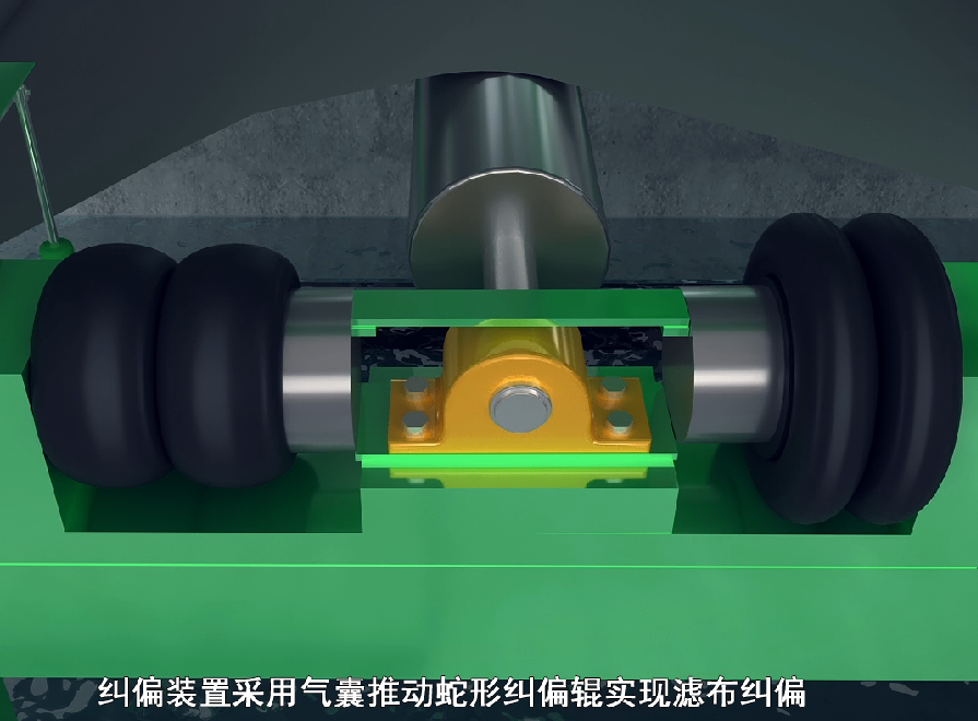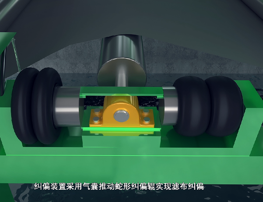 在正常運(yùn)轉(zhuǎn)中,濾布是不會(huì)碰到糾偏裝置的檢測(cè)桿。當(dāng)濾布跑偏時(shí),濾布會(huì)碰到檢測(cè)桿,檢測(cè)桿偏移,自動(dòng)糾偏裝置中的氣囊會(huì)一側(cè)充氣,一側(cè)放氣,帶動(dòng)糾偏輥蛇形偏移,使濾布改變偏移方向,恢復(fù)到正常運(yùn)轉(zhuǎn)軌跡。